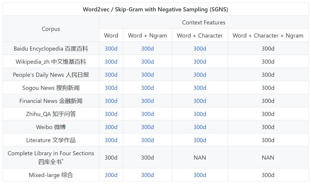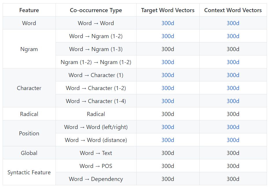 这一部分,可以获取词层面之上的任意语言单元向量。例如,汉字向量包含在词-汉字的上下文向量中。所有向量都在百度百科上使用 SGNS 训练。