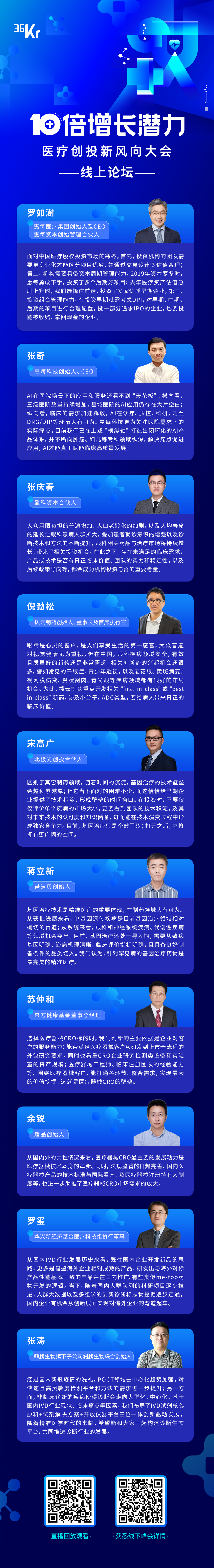 7月20日,36氪邀请医疗行业一线投资机构、知名创业公司,举办了「10倍增长潜力」医疗创投新风向线上论坛,共分为一场致辞+五场高峰对谈。