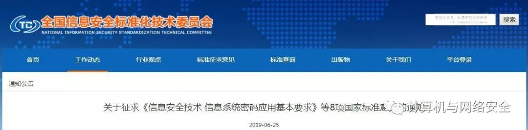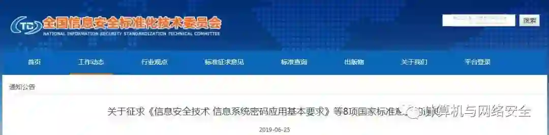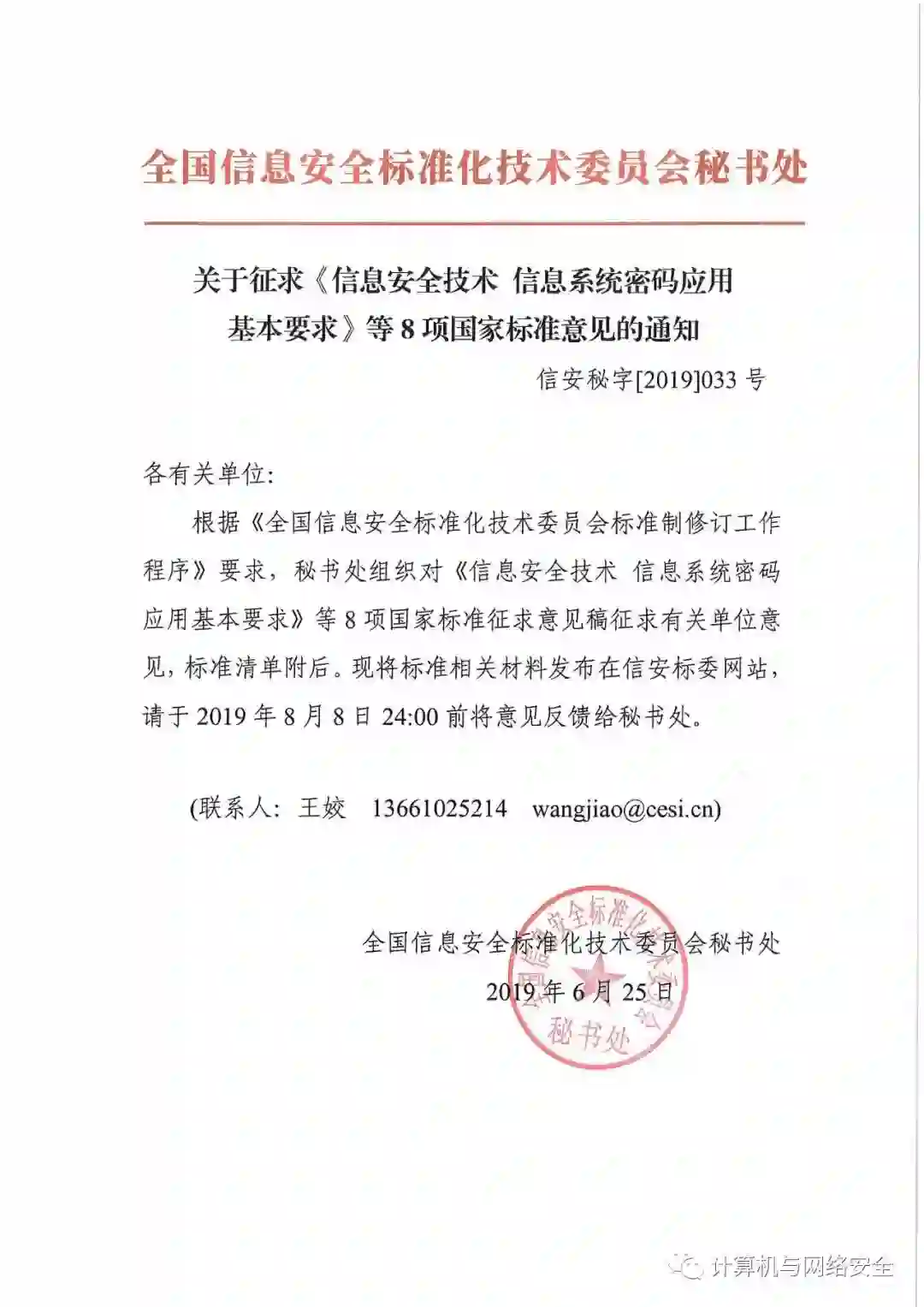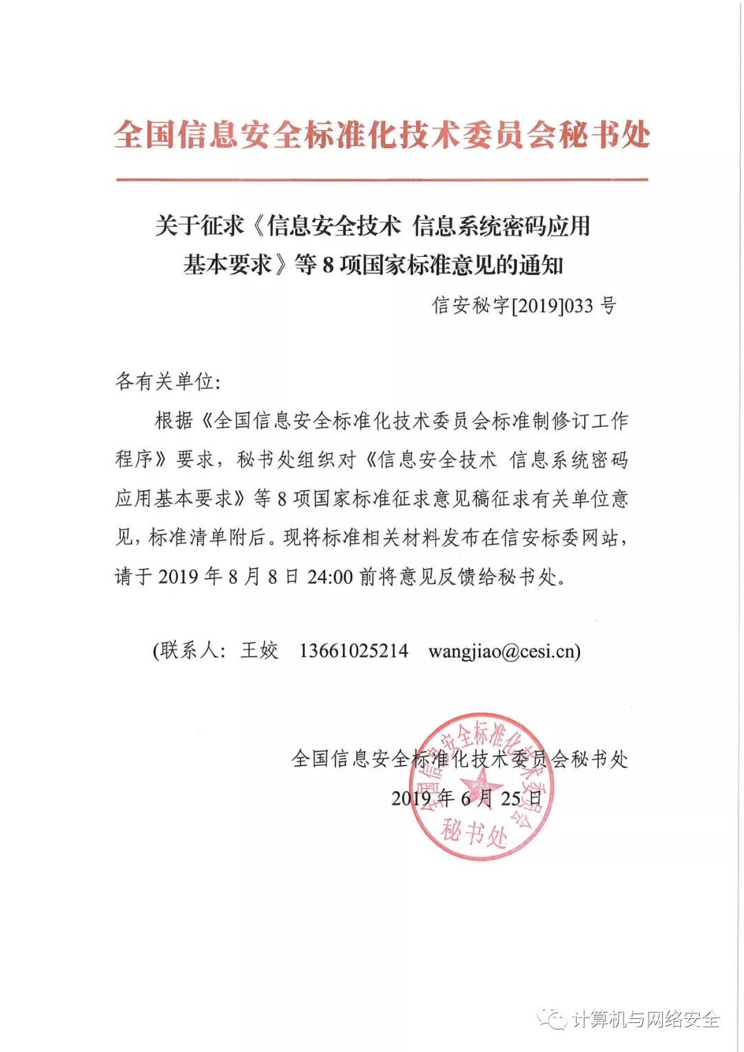 根据《全国信息安全标准化技术委员会标准制修订工作程序》要求,秘书处组织对《信息安全技术 信息系统密码应用基本要求》等8项国家标准征求意见稿征求有关单位意见,标准清单附后。现将标准相关材料发布在信安标委网站,请于2019年8月8日24:00前将意见反馈给秘书处。