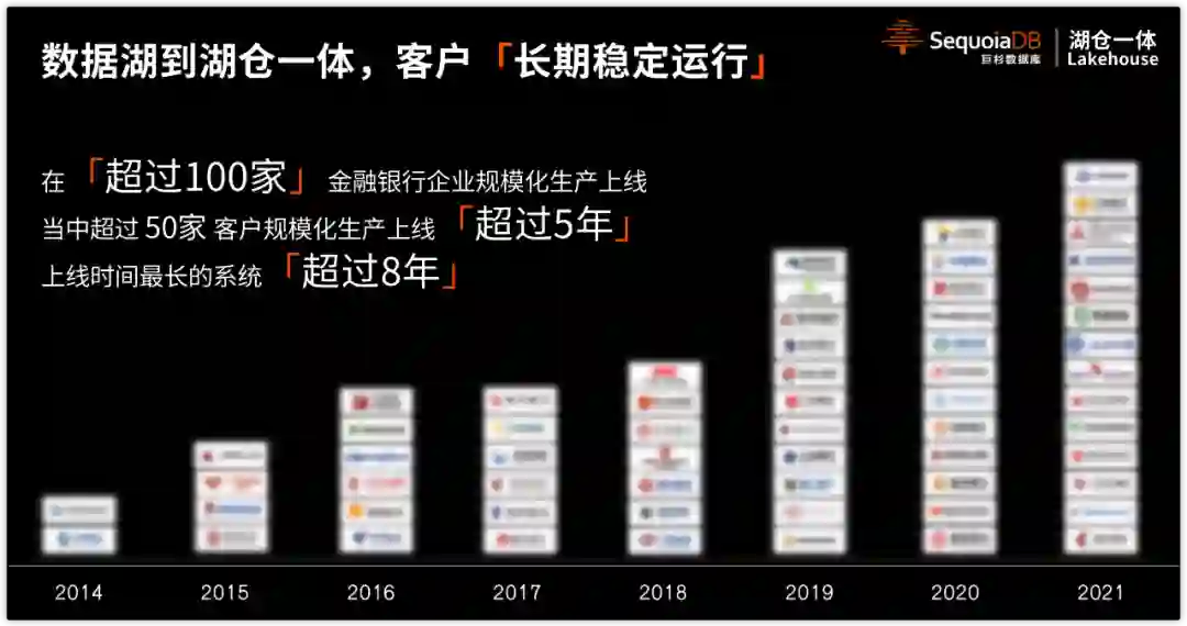 2012 年巨杉数据库正式成立,并于 2014 年正式商用,产品已在超过 100 家金融银行客户规模化生产上线,其中不乏中国人保、民生银行、南方电网、中国太平保险等世界 500 强企业及广发银行、广东省农信、四川省农信、吉林省农信、恒丰银行、渤海银行、上海银行、上海农商银行、中国证券登记结算有限公司、海通证券等典型客户。在单一客户中 SequoiaDB 所支持的最大数据量,已经达到 1.4 万亿行、服务器规模超过 400 台、数据容量达数 PB;SequoiaDB 更服务于多个政府平台,如支持“粤省事”平台的医保、社保数据查询,这些数据也助力新冠核酸检测,帮助政府匹配核酸检测情况。