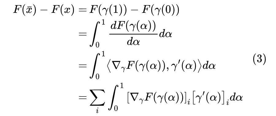 从 x 移动到 的总成本为 ,它是每个分量的成本之和,而每个分量的成本近似为 ,所以我们可以用 作为第i个分量的重要性指标。当然,不管是 还是 ,它们的缺陷在数学上都是一样的(梯度消失),但是对应的解释却并不一样。前面说了, 的缺陷源于“敏感程度不足以作为重要性的良好度量”,而纵观这一小节的推理过程, 的缺陷则只是因为“等式(2)仅仅是近似成立的”,但整个逻辑推理是没毛病的。2.2 积分恒等很多时候一种新的解释能带给我们新的视角,继而启发我们做出新的改进。比如前面对缺陷的分析,说白了就是说“ 不够好是因为式(2)不够精确”,那如果我们直接能找到一个精确相等的类似表达式,那么就可以解决这个问题了。积分梯度正是找到了这样的一个表达式:设 代表连接 x 和 的一条参数曲线,其中 ,那么我们有: