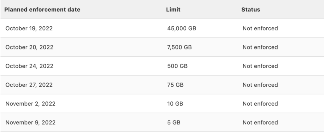 根据官方公布的时间表,针对命名空间存储限制,GitLab 将先从 45000 GB 开始往下实施,逐步降低,并最终将其限制到 5 GB。