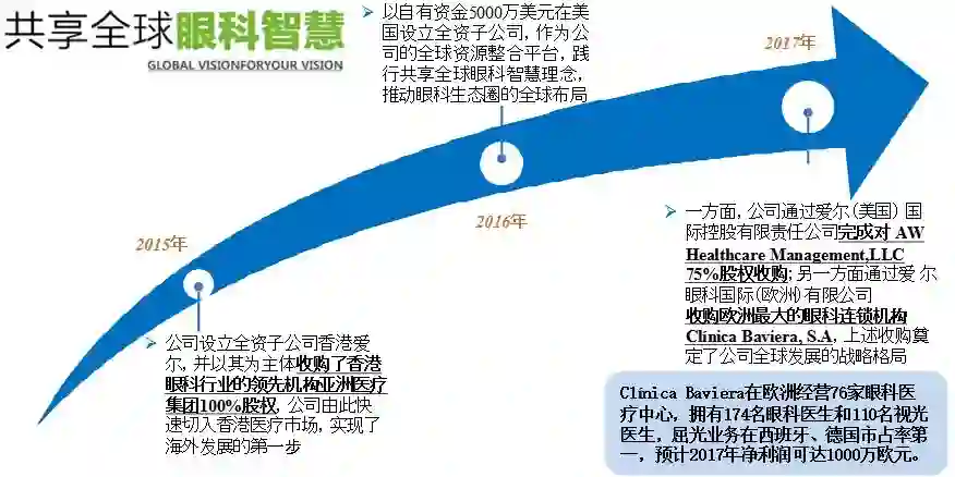 这两年,爱尔陆续开展全球并购,吃下了香港的亚洲医疗、美国的AW Healthcare Management,欧洲的Clinica Baviera等一系列高端眼科机构。