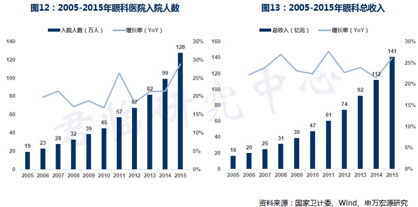 在疾病谱变化、潜在需求释放、消费升级的共同作用下,2005-2015年眼科医院入院人数、眼科总收入的复合增长率分别为20.96%和24.03%,并且近几年有加速趋势。