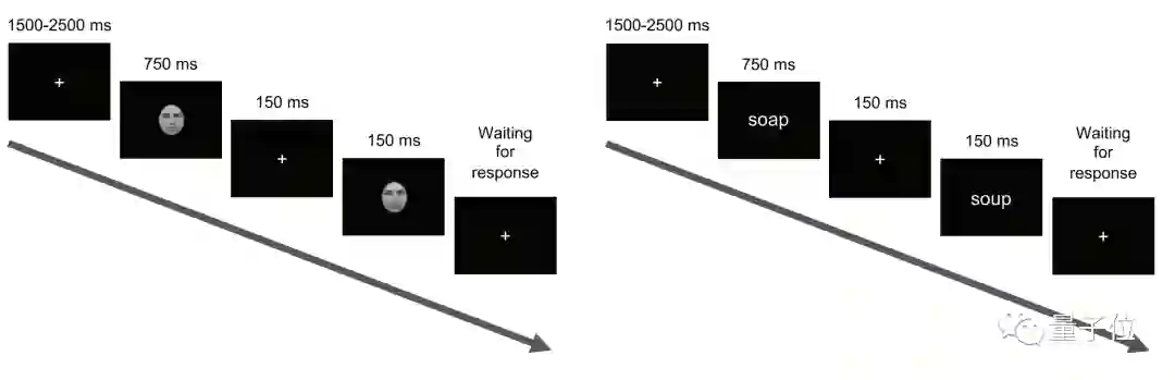 然后,被试们需要说出刚刚看到的人像或单词是相同还是不同的。