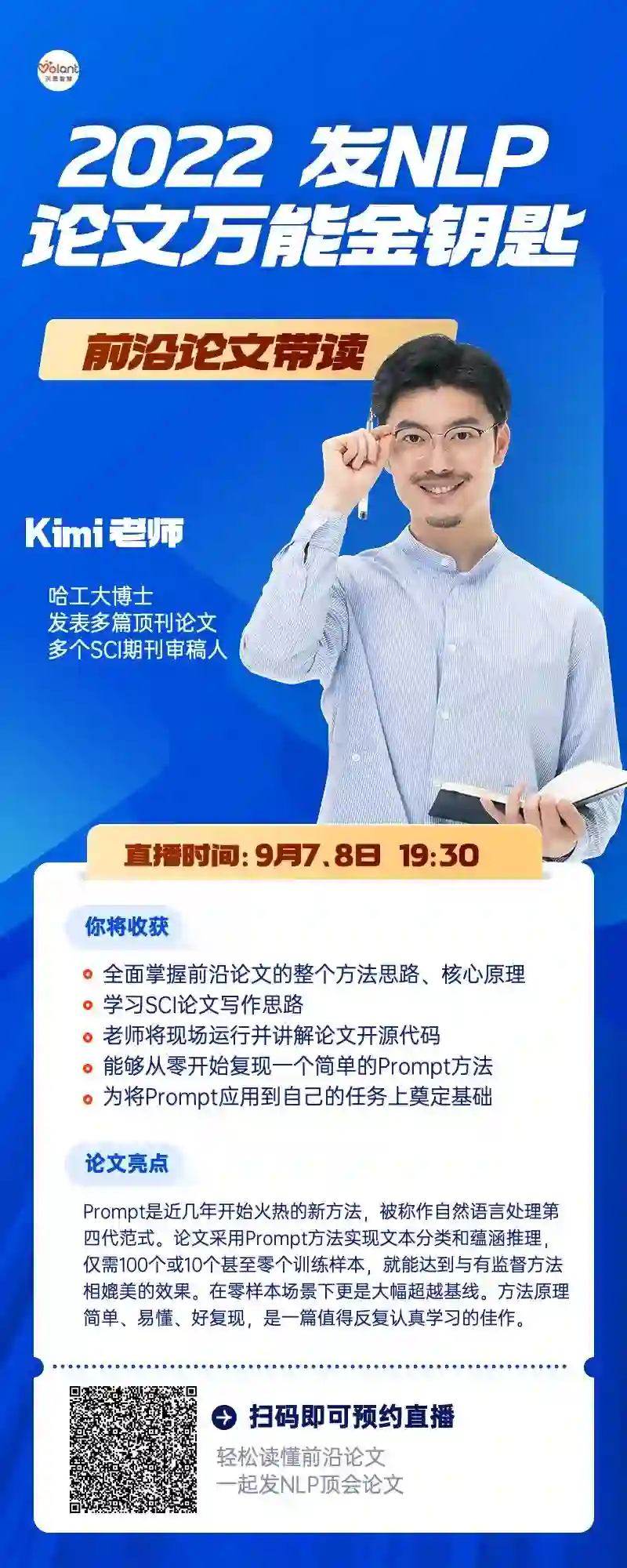 9月7、8日,沃恩智慧论文带读公开课,Kimi老师将带读关于prompt的NLP前沿论文。