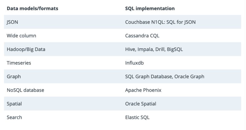 另一个数据库阵营是 NoSQL。虽然现在对 NoSQL 的定义是“Not Only SQL”,但其实 NoSQL 在最开始想要远离 SQL,并尝试使用其他语言和框架,比如 map-reduce。但在十年之后,几乎每一个流行的 NoSQL 数据库都有了 SQL 变种:Couchbase 的 N1QL、Cassandra 的 CQL 和 Elasticsearch 的 ElasticSearch SQL。你可能会说:“MongoDB 并没有 SQL”。但我敢肯定地说:“它将会有一个非常简单的 SQL 实现”。