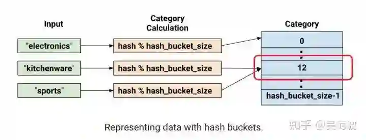 另一个方法,也是非常常见,即对稀疏的 id 做个聚类处理,论文提了一个规则,但和 Airbnb 的业务耦合太深了,其他业务很难直接应用,但可以借鉴思想。阿里以前提过一种 sixhot 编码,来缓解这个问题,不知道效果如何。也可以直接 hash,个人觉得这个会有损,但 tensorflow 的官网教程上,feature columns 部分关于 Hashed Column 有一段话说是无损的: