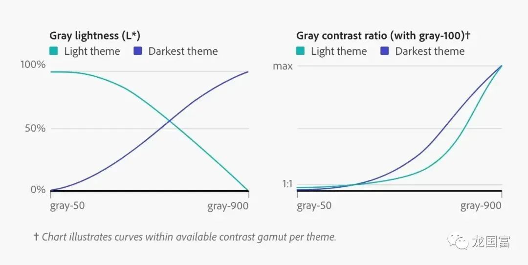 Adobe 的Spectrum 色彩体系有三个主题,分别是浅色(light)、深色(dark)、最深色(darkest)。以往在浅色主题转换至深色主题的时候,只是简单的进行对比度翻转。