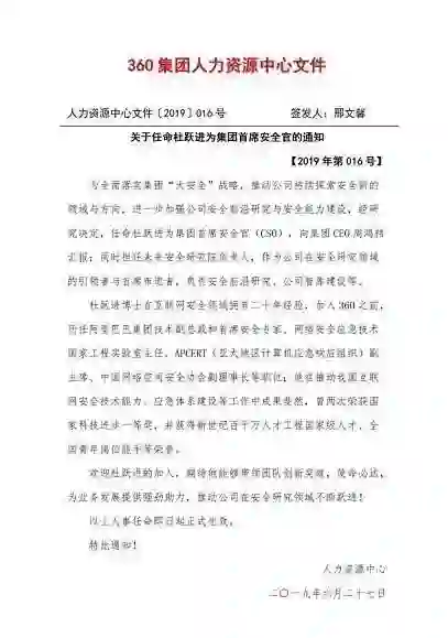 6月27日消息,360集团发布文件宣布:“任命杜跃进为360集团首席安全官(CSO),向集团CEO周鸿祎汇报,同时担任未来安全研究院负责人,作为公司在安全研究领域的引领者与首席布道者,负责安全前沿研究,公司智库建设等。”
