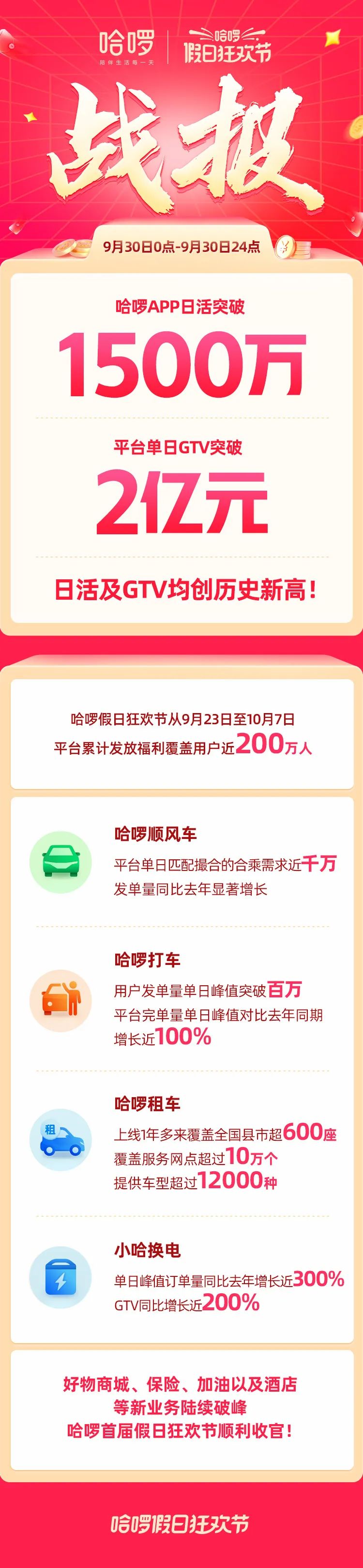 作为哈啰成立6年以来举办的最大规模之一的促销活动,首届狂欢节于10月7日结束,参与人数超过千万人次,产生了不少颇为亮眼的数据:9月30日当天,哈啰共享两轮出行业务达到了全年GTV峰值,其App日活也以超40%的增速突破1500万,平台GTV实现了超2亿的历史新高。十一国庆期间,哈啰平台单日匹配撮合的顺风车合乘需求近千万,平台打车用户完单量的单日峰值也同比实现了近100%的增长。