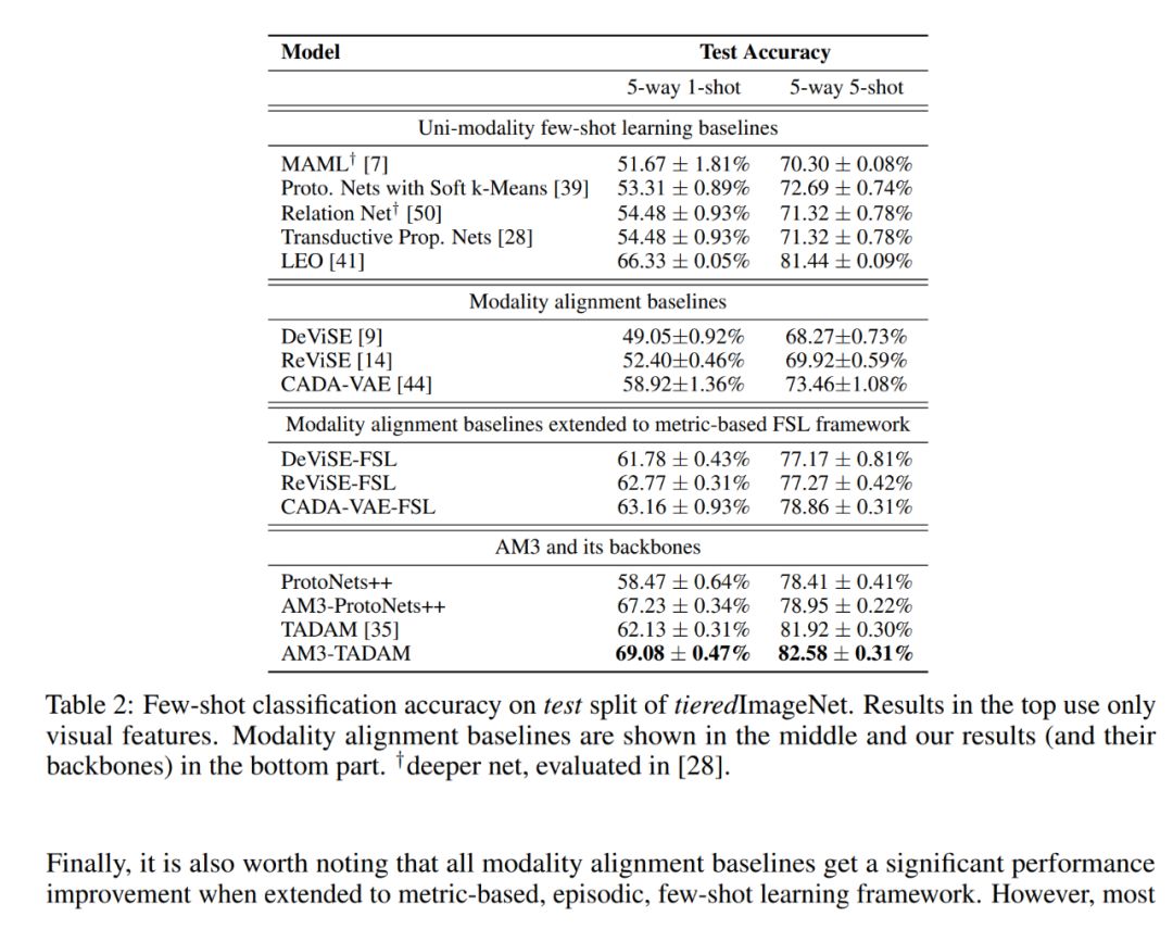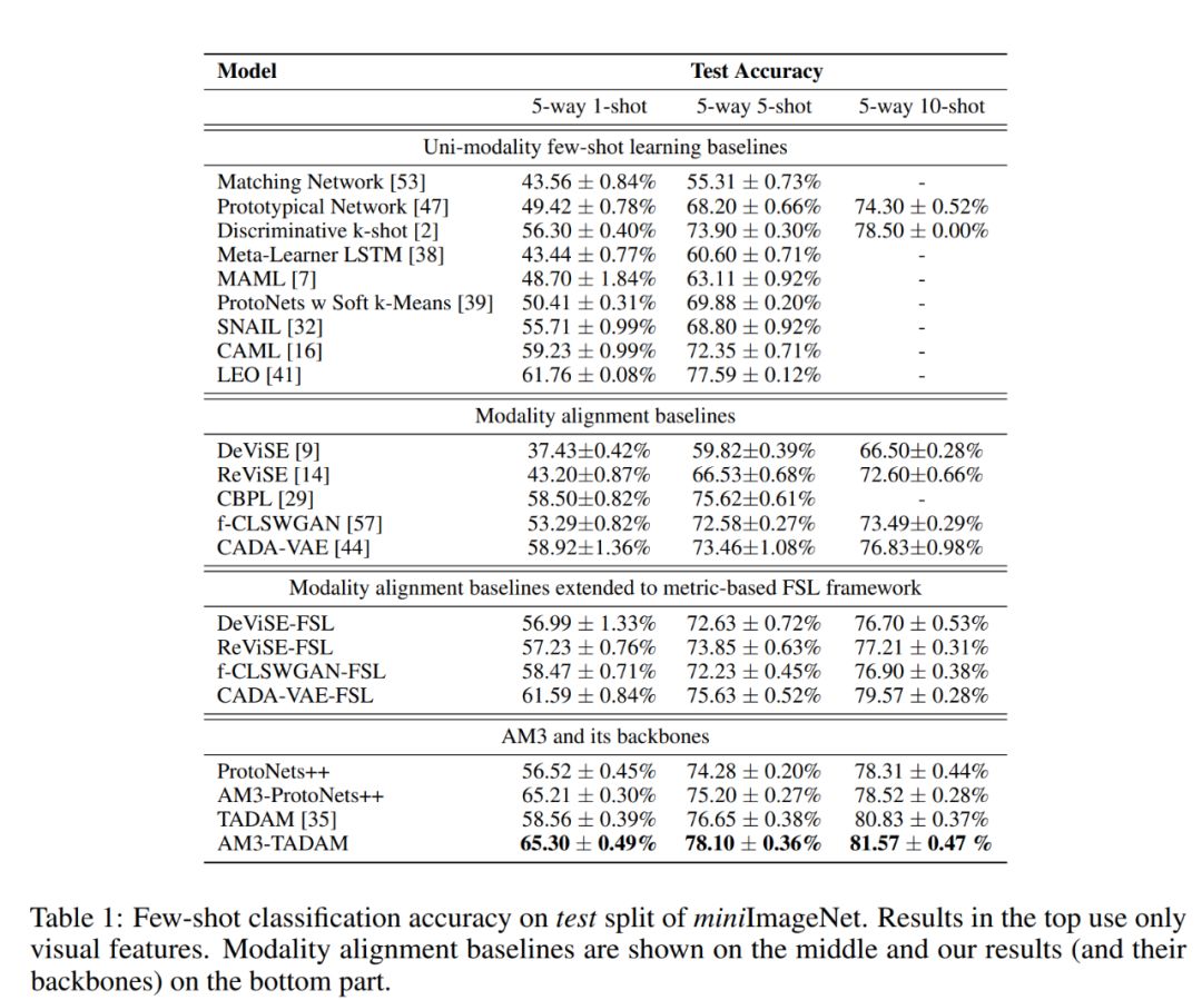 比如根据图像所属的种类,让 AM3 能够采用一种自适应的凸结合(adaptive convex combination)方式糅合两个表征空间并且调整模型关注侧重点,从而完成更精确的少样本分类任务。对于困难样本,在上图左边不同类别视觉相似度高的情况下,AM3 侧重语义信息(Semantic modality)从而获得泛化的背景知识来区分不同类别;而上图右边同类别图片视觉差距大的情况下,AM3 模型侧重于视觉信息(Visual modality)丰富的局部特征从而更好捕捉同类图片存在的共性。