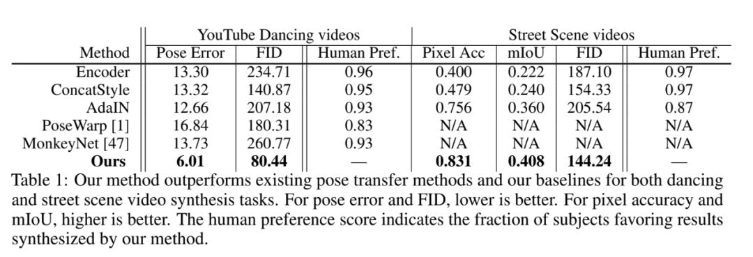 基于如上的整体网络结构,few-shot vid2vid 又包含了诸如基于注意力的聚合方法(attention-based aggregation),图像变形(example image warping),训练与推理过程调整等具体实现中的技巧,在 YouTube dancing videos,Street-scene videos,Face videos 三个公开数据集上做了方法的验证,都取得了目前最好的性能指标。