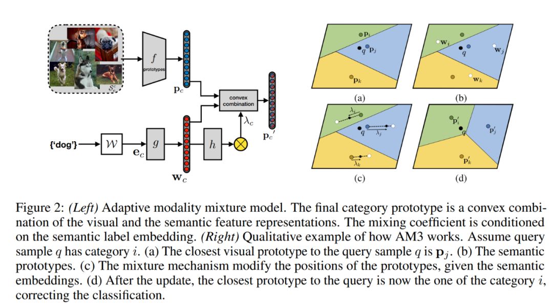 根据如上的场景假设,文章提出一个自适应交叉混合的机制(Adaptive Modality Mixture Mechanism,AM3):针对将要被学习的图像类别,自适应地结合它存在于视觉和语义上的信息,从而大幅提升少样本场景下的分类任务性能。具体来说,自适应的 AM3 方法并没有直接将两个信息模块对齐起来然后提供辅助,也没有通过迁移学习转化语义信息作为视觉特征辅助(类似视觉问答 VQA 任务那样),而是提出更优的方式为,在少样本学习的测试阶段独立地处理两个知识模块,同时根据不同场景区分适应性地利用两个模块信息。