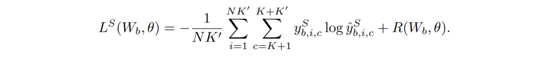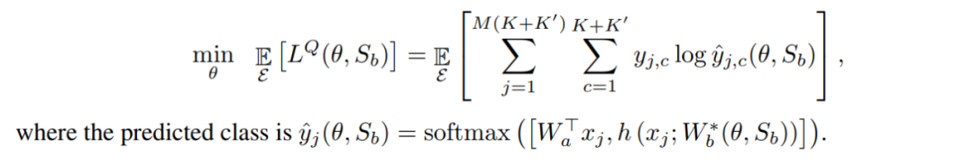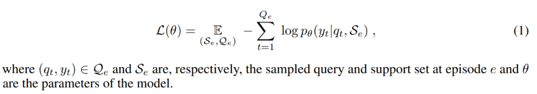 首先少样本分类采用的学习方式仍然是 K-way N-shot 的节点学习(episodic training)过程,一方面是来自 N 个类别的 K 张训练图片 S 用作支撑集(Support Set),另一方面是来自同样 N 个类别的测试图片作为查询集 Q(Query Set),并根据分类问题损失定义得到如下参数化的方程为优化目标: