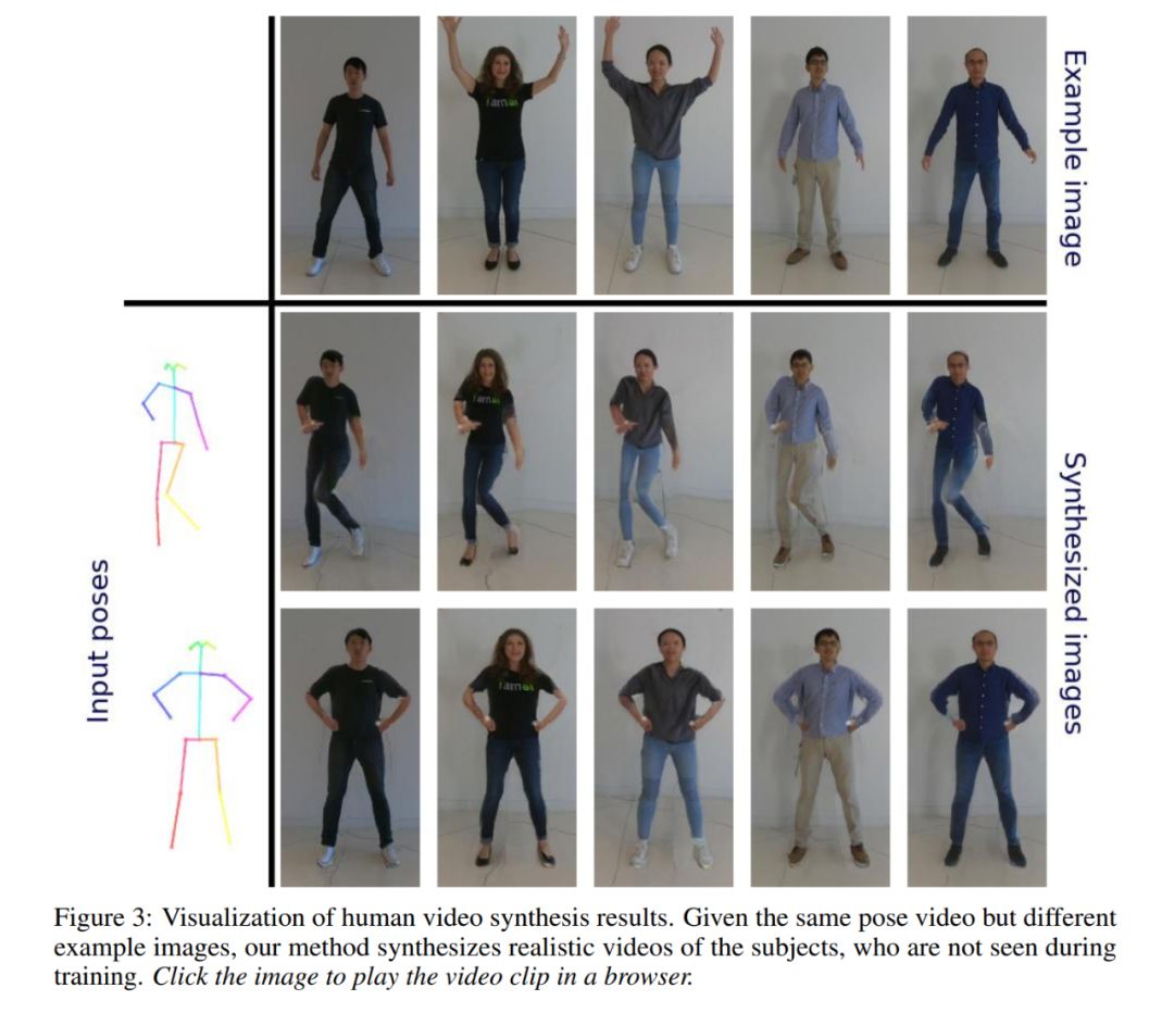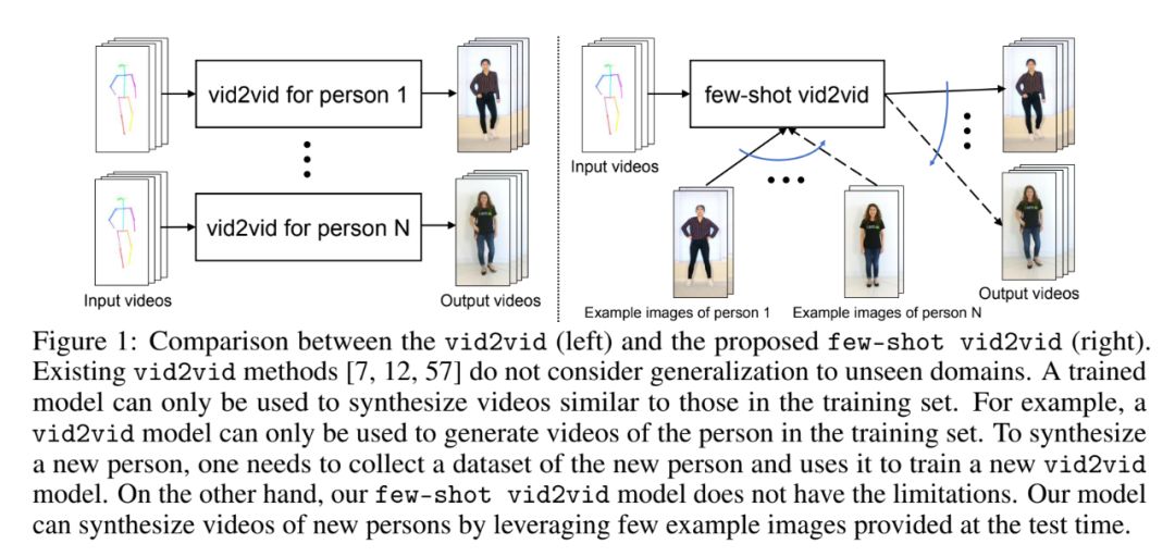 类比于 Image-to-Image, 将特定场景下的输入图像转换到另一场景生成新图,Wang et al 在 2018 提出的视频到视频的合成(Video-to-Video synthesis, 简称 vid2vid)将连续多帧图像构成的视频,转换到新场景下并生成新的语义场景下的视频。本文是作者在该文基础上做的扩展。参考下图,根据对应的人体关键点姿态运动视频(pose videos),模型相应合成真人的动作视频。之前提出 Vid2vid 文献的局限也非常明显:数据需求量太大,合成模型表达能力有限。首先,对于合成某人真人运动视频要求模型有大量目标对象的图像来完成训练,对数据量的要求巨大,其次单个姿态到真人视频合成 vid2vid 模型通常只能合成训练集里包括的人体个体,无法生成任何不处于训练集中的人的运动视频。