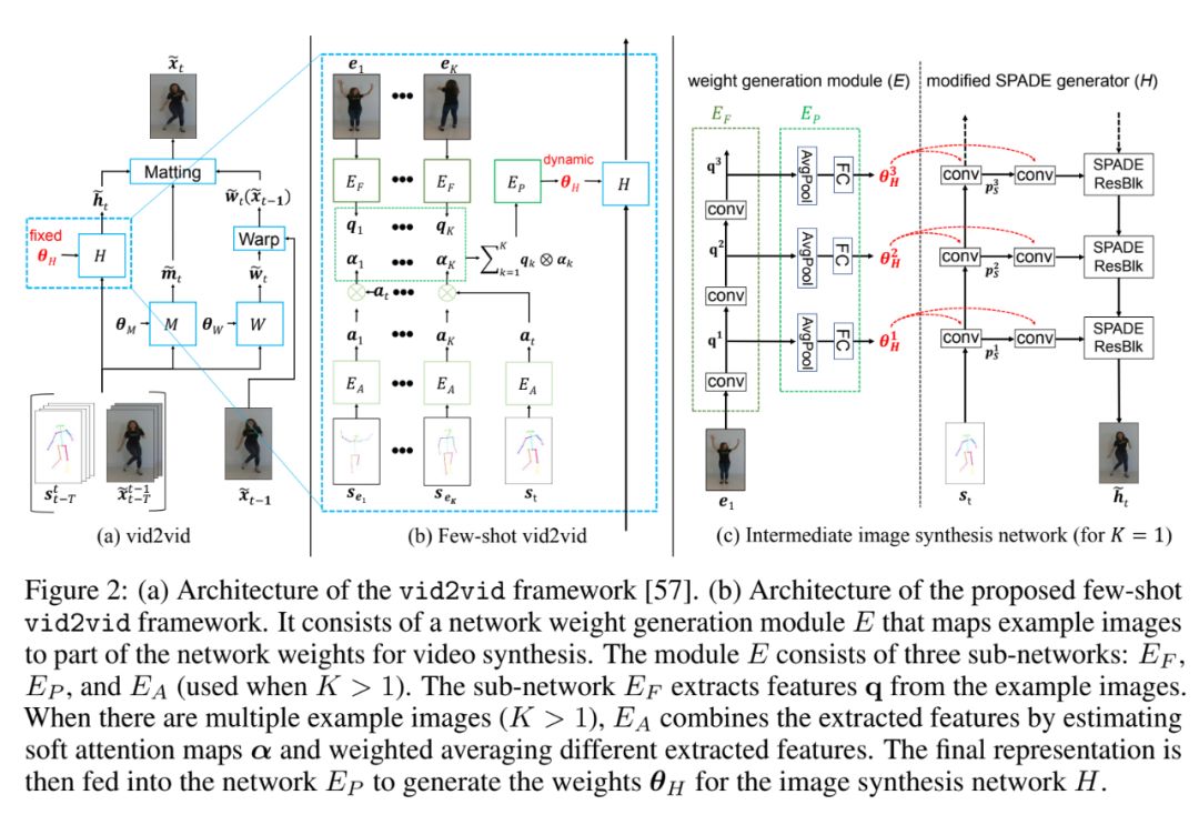 few-shot vid2vid 在整体框架上仍然沿用了目前的 SOTA 方法,保留了光流预测模块子网络 W 以及软掩盖图预测模块子网络 M。而考虑到我们的额外少量目标图片输入,few-shot vid2vid 集中优化了中间图像合成的模块 H(Fig b, c),用一个语义图像合成模型 SPADE 作为图片生成器取代了原先工作中的生成模型,SPADE 模型包含多个空间微调分支(spatial modulation branch)以及一个主要的图像合成分支,同时提出一个额外的网络参数生成模块 E(network weight generation module),使用该模块 E 作用于每个空间微调分支,来抽取一些视频内存在的有用模式,从而使得生成器能够合成未训练过的场景的视频结果。