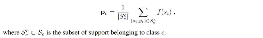 在基础模型网络方面,AM3 采用了一个比较简洁的 Prototypical Network 作为例子,但也可以延伸到其他网络使用:利用支撑集为每个类别计算一个类似于聚类一样的中心聚点(centroids),之后对应的查询集样本只需与每个中心点计算距离就可以得到所属类别。对于每一个节点 e(episode)都可以根据平均每个类别所属支撑样本的嵌入特征得到嵌入原型 Pc(embedding prototype)以及分布的函数 p: