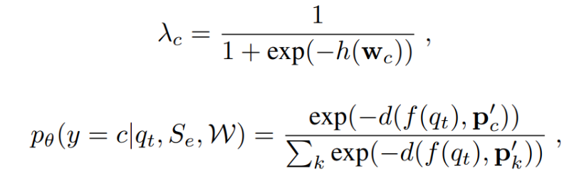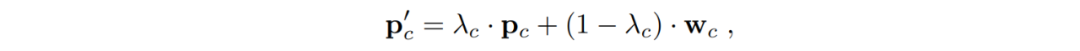 在 AM3 模型里,为了如之前说到的更灵活地捕捉语义空间的信息,文章在 Prototypical Network 的基础上进一步增加了一个预训练过的词嵌入模型 W(word embedding),包含了所有类别的标签词向量,同时修改了原 Prototypical Network 的类别表征,改为同时考虑视觉表达与语义标签表达的结合。而新模型 AM3 的嵌入原型 P』c 同学习函数,用类似正则项的更新方式得到为: