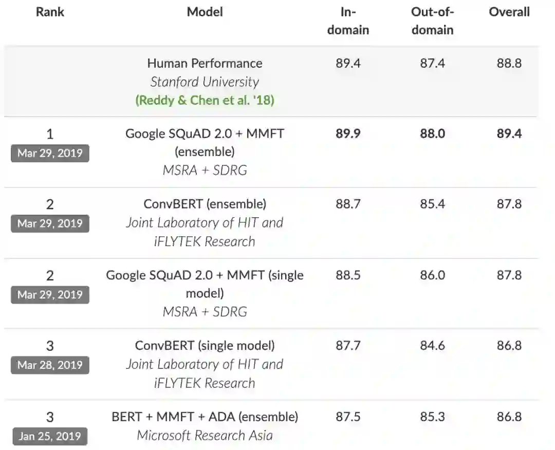 据 CoQA 榜单显示,微软研究团队提交的集成系统分布取得了 89.9 的领域内得分、88.0 的领域外得分、89.4 的整体 F1 得分,而在此数据集上人类的表现分别为 89.4/87.4/88.8。