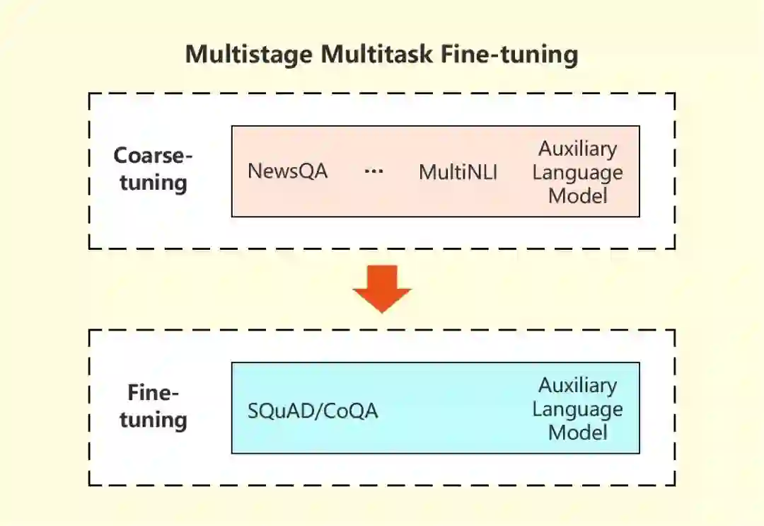 据介绍,微软研究团队的方法使用了特殊的策略,也就是多个相关任务学习到的信息被用于改进最终的机器阅读理解任务。在此多阶段、多任务精调方法中,研究人员首先在多任务环境下从相关任务中学习 MRC 关联背景信息,然后在目标任务上精调模型。在两个阶段,都使用语言建模作为辅助任务,帮助降低对话问答模型的过拟合。