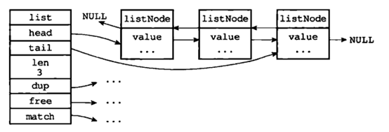 从图中可以看出Redis的linkedlist双端链表有以下特性:节点带有prev、next指针、head指针和tail指针,获取前置节点、后置节点、表头节点和表尾节点的复杂度都是O(1)。len属性获取节点数量也为O(1)。