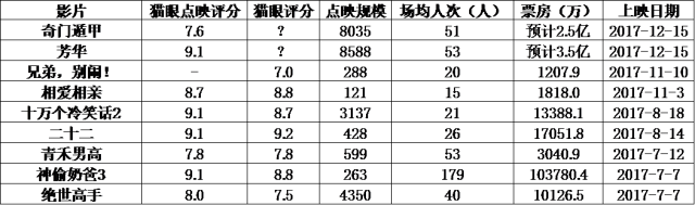 两部影片的点映成绩悲喜交加,《奇门遁甲》猫眼7.6分,淘票票7.8分,《芳华》猫眼9.1分,淘票票9.1分,从评分不难看出《奇门遁甲》的口碑非常低迷,《芳华》头炮打的响亮。