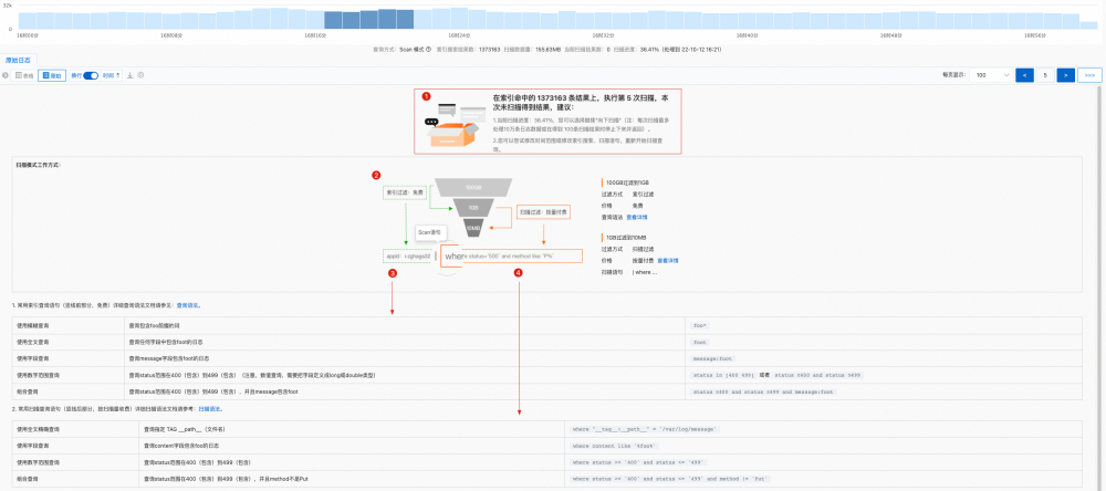 指定时间范围内如果命中大量日志,需通过翻页机制实现迭代获取,在柱状图上浅色部分是通过索引过滤后的候选结果,本次 Scan 翻页计算所覆盖的数据部分通过深色柱状图来展示,每一次翻页操作伴随着深色柱状图的平移。