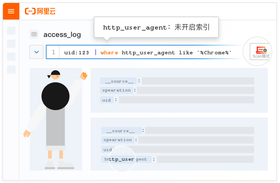 针对日志 Scan 场景,SLS 在 UI 新特性上的匹配包括: