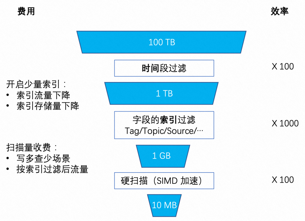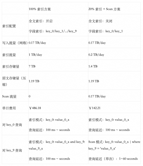 2. 其它的低频日志字段或不明确的字段,不配置索引,查询需求通过 Scan 在运行时完成计算。