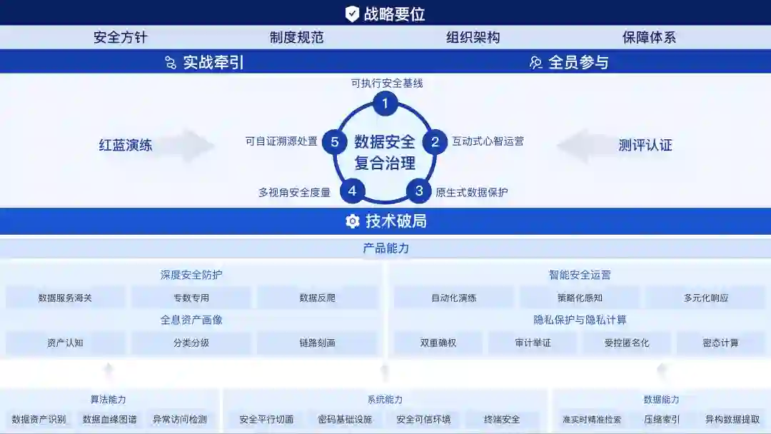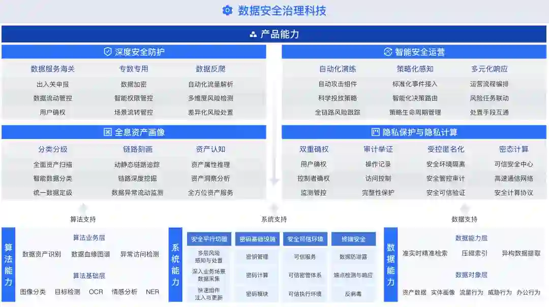数据安全治理科技从系统能力、算法能力、数据能力和产品能力四大维度阐述了如何建设与完善数据安全治理的技术体系。系统能力包括安全平行切面、密码基础设施、安全可信环境、终端安全等,旨在构建安全可信的系统和环境支持,为数据安全治理提供底层环境支撑。算法能力重点关注数据资产识别、数据血缘图谱、异常访问检测等智能算法建设,应对数据安全治理中的“看见数据”、“看清数据”和“理清风险”三大难题。数据能力主要提供准实时精准检索、压缩索引、异构数据提取等数据加工能力,实现大规模数据的准实时快速定位。产品能力旨在从全息资产画像、深度安全防护、智能安全运营、隐私保护与隐私计算等领域出发,构建从数据资产识别到动态安全管控到智慧安全运营到数据价值利用的全方位、体系化的产品能力,满足不同数据安全治理场景下的技术需求。