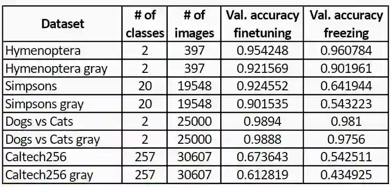 我们观察到的第一个细节是,相比色度数据集而言,训练灰度数据集准确率会下降。这与其他文章作者观察一致,即基础数据集和目标数据集之间的域差异越大,迁移效果越差。