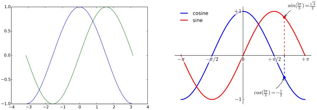 左图为采用 matplotlib 默认设置绘制的正弦和余弦函数图像。虽然图片足够清晰,但是你还可以通过调整各种设置来进行改进,如右图所示。