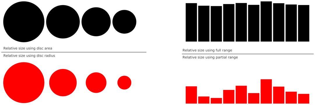 在图的左侧,我们展示了四个值:30、20、15、10。在左上角,我们使用圆盘面积来表示数值,而左下方图片使用圆盘半径来表示。结果在视觉上非常不同。在后一种情况下(红色圆盘),最后一个值(10)与第一个值(30)相比显得非常小,然而这两个值之间的比率仅为 3∶1。这种情况在文献中实际上非常常见,因为用于生成圆或散点图(具有不同大小的点)的命令(或界面)使用半径作为默认值来指定圆盘大小。因此,使用半径长度表示一个数值看起来是合乎逻辑的,但这会产生误导。