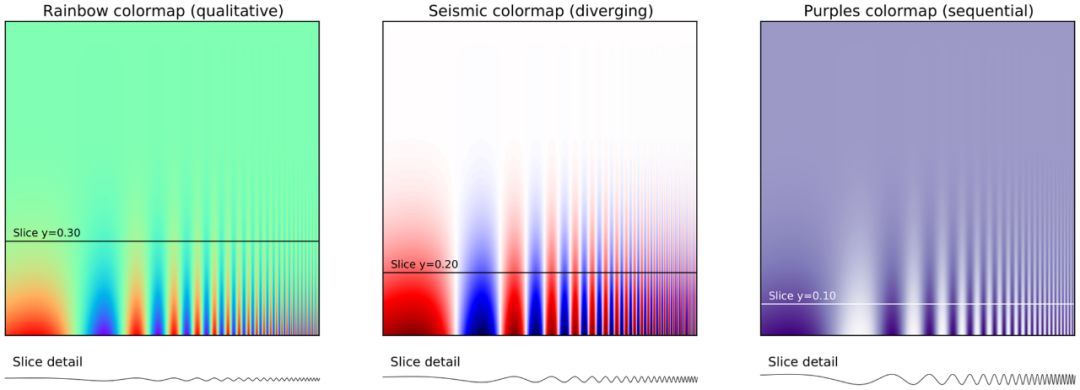 这幅图使用三种不同的颜色设置表现了相同的信号,其中频率从左向右逐渐增加,强度从上到下逐渐增强。彩虹色图(rainbow colormap,定性)和地震色图(seismic colormap,发散)都不适合展示这样的信号,因为它们会隐藏高频区域(右下角)的细节信息。如果使用连续色图,比如最右紫色的色图,我们就更容易看到高频区域的细节。图片改编自文献 [5]。