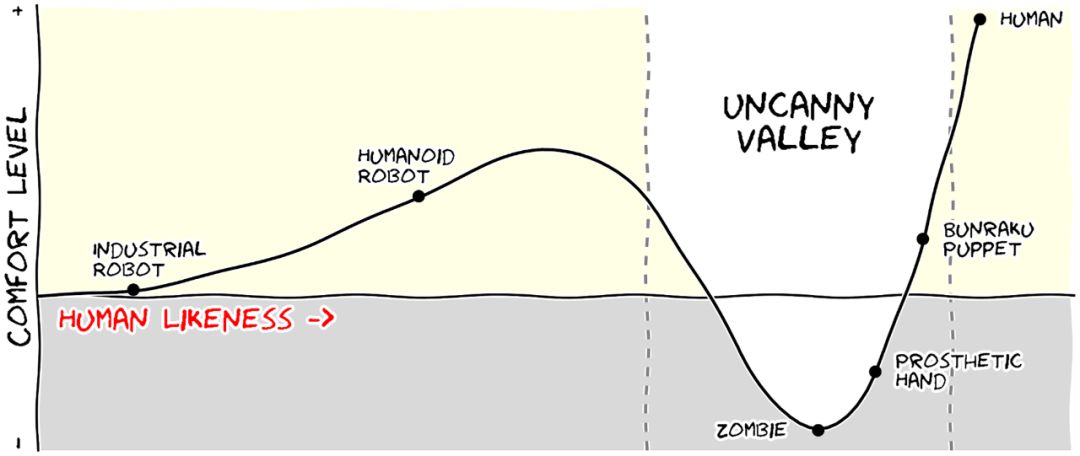 这张图片是一个极端的案例,在这种情况下,即使图片的美感值得怀疑,其中的信息仍然非常清晰。恐怖谷理论是机器人技术领域的一个众所周知的假设,它将我们的舒适度与机器人与人类的相似程度联系起来。为了表示这个理论假设,研究人员使用了一个假设的数据来描述: