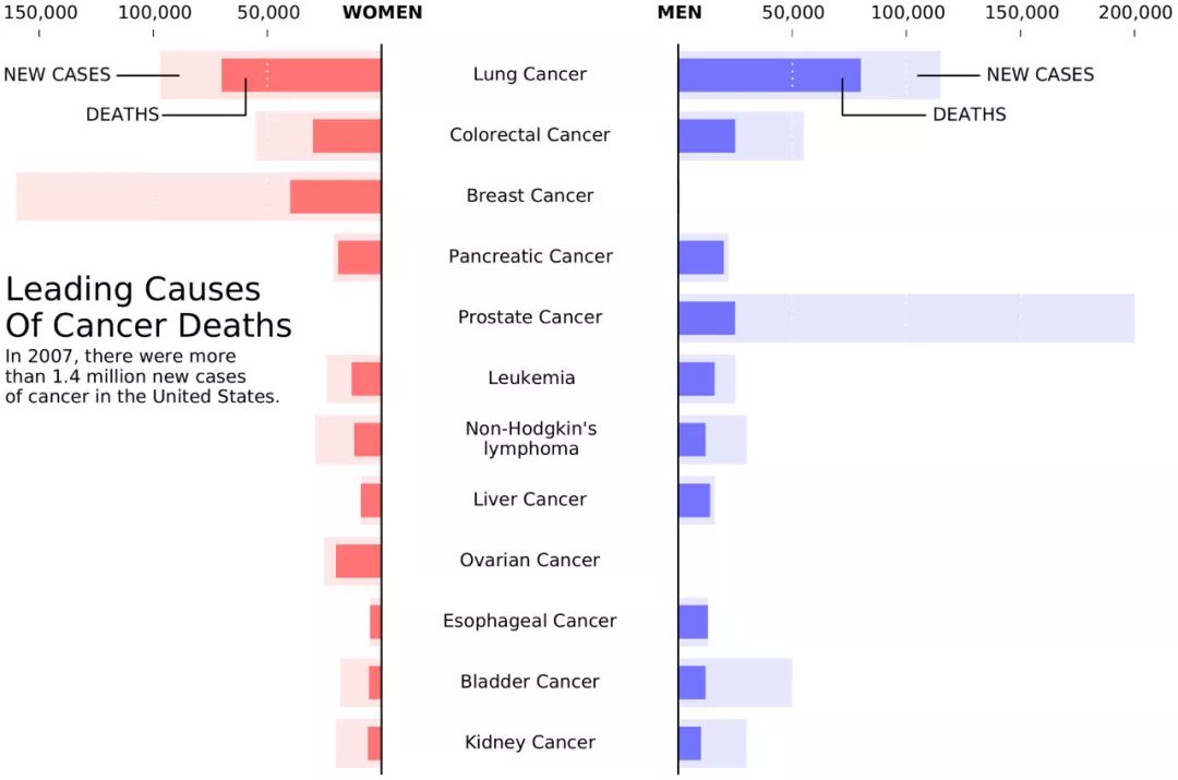 这张图片根据 2007 年在《纽约时报》(New York Times)上发布的一张图片重新制作。新图片使用了近似数据,用 matplotlib 绘制。数据由四个类别(男性死亡/病例,女性死亡/病例)组成并可以使用经典的双栏(死亡/病例)条形图表示。这里使用的布局比原图片更适合目标受众。这里他们利用了这样一个事实,即新的病例数总是大于相应的死亡人数,所以可以将两组数据对应的图像重叠起来。此外,他们还利用了阅读方向上的优势(《纽约时报》使用英语,阅读方向是从左到右),以便于男女之间的比较,同时图片中间的标签醒目展示了图片上的主要信息,即不同的癌症。
