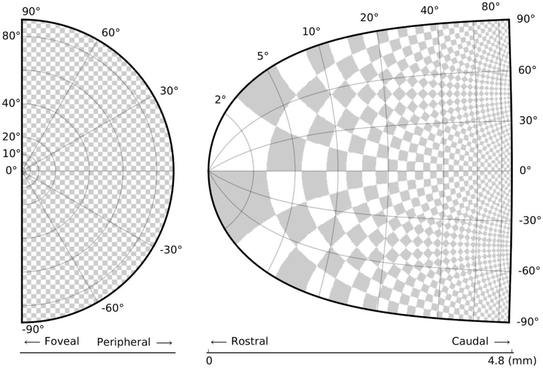 上丘(superior colliculus, SC)是位于多功能通路交叉点的脑干结构。有神经生理学研究表明,上丘中的活跃神经元群将视觉目标的位置编码,从而诱发眼球运动。从视网膜表面(左侧)到瞳孔表面(右侧)的投影基于一个标准的定量模型,其中一个对数映射函数描述了从视网膜坐标到瞳孔坐标的投影关系。这种对数映射在眼跳(saccade)的决策中起着重要作用。为了更好地说明这个作用,研究人员使用了人工棋盘图案,即使在实验中没有使用这种图案。这个棋盘图案清楚地显示了中央凹注视区域的极端放大,这就是图形的主要信息。