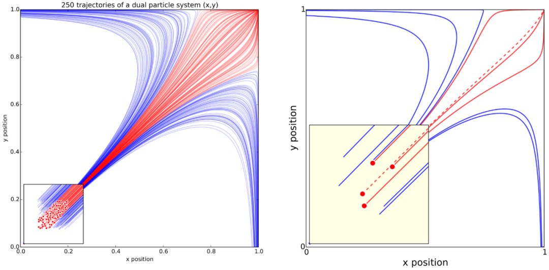 这两幅图片代表了对双粒子系统轨迹的相同模拟,其中两颗粒子之间存在相互作用:
