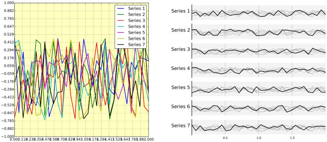 我们有同等重要的七个样本,为了直观地比较它们,我们想把它们全部展示出来(确切的信号值应该在别处给出)。左图展示了什么是最糟糕的设计:所有的曲线互相重叠,不同的颜色(软件自动作出了糟糕的选择)对区分它们并没有帮助。图例框盖住了部分图形,因此无法检查重叠区域中是否有任何有用的信息。此外还有很多问题:x 轴的坐标相互重叠,难以阅读,而且到小数点后三位的精确度似乎也不携带任何重要的信息。最后,图片中的网格并没有帮助,因为它没有与信号对齐,考虑到采样点的数量很少,可以认为数据是离散的。