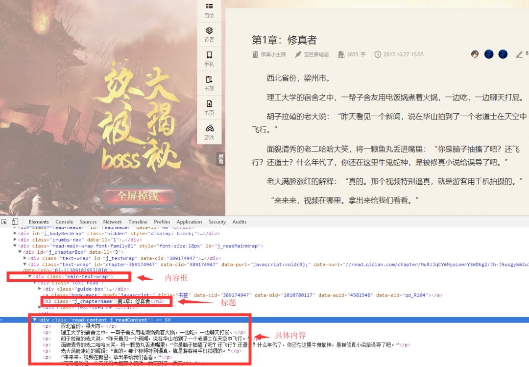 可以看到,章节的整个内容在类名为 main-text-wrap 的 div 标签内,标题是其中类名为j_chapterName的 h3 标签,具体内容是类名为read-content j_readContent的 div 标签。