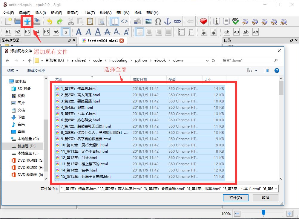要制作 ePub 电子书,我们首先通过 Sigil 把我们的抓取的文件加载到程序中,在添加文件对话框中我们全选所有文件: