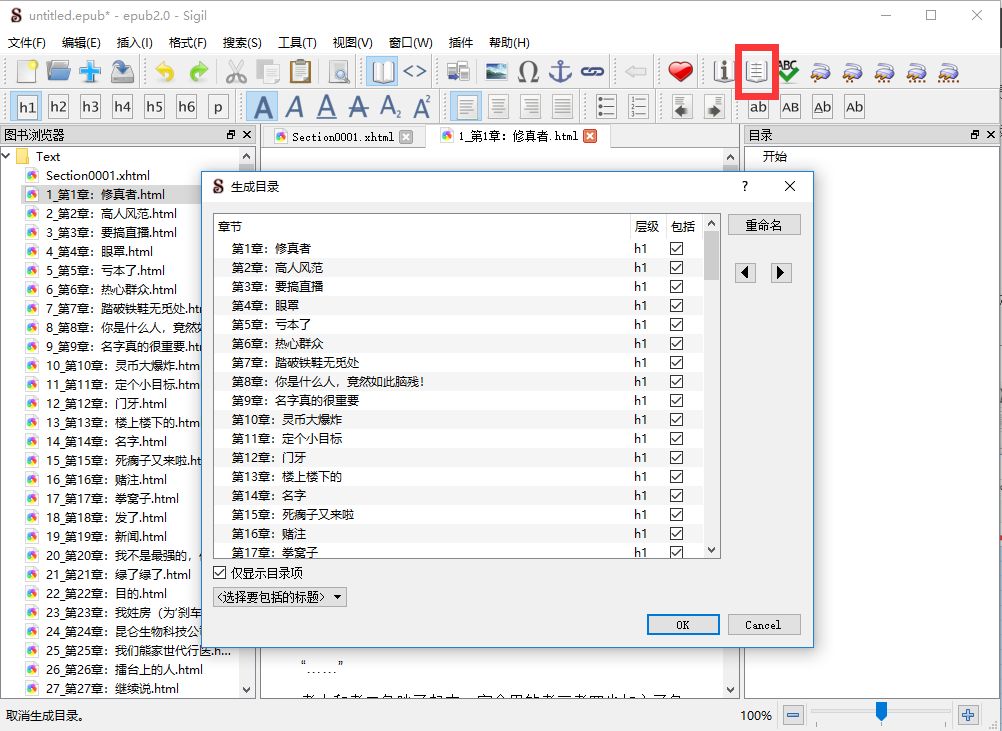 文件中存在 HTML 的 h 标签时,点击生成目录按钮就可以自动生成目录,我们在前面数据抓取时已经自动添加了 h1 标签: