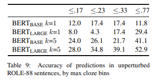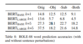 表 8 显示了这些扰动单独和一起的结果。我们观察到几个显著的模式。首先,删除对象(“-Obj”)或者主题(“-Subj”)对 BERT(BASE)k=1 或者 k=5 的精确度影响相对较小。这与我们在 BERT(LARGE) 中看到的情况大不相同,当对象或主题信息被删除时,其准确性会大幅下降。这些模式表明,BERT(BASE) 不太依赖主语 - 宾语结构的完整细节,而是主要依赖于参与动词预测的名词中的一个或另一个。另一方面,BERT(LARGE) 似乎对这两个名词都做了大量的使用,这样一来,任何一个名词的丢失都会对预测的准确性造成非平凡的破坏。