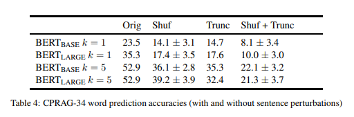 因为常识和语用推理是不常用的概念,所以值得探索 BERT 能在多大程度上基于简单的线索(如单词恒等式或 n-gram 上下文)实现这种性能。为了测试词序的重要性,我们对每个 item 的第一句中的单词进行无序排列,使信息混乱,但保留了所有单个单词的完整性(表 4 中的“shuf”)。