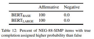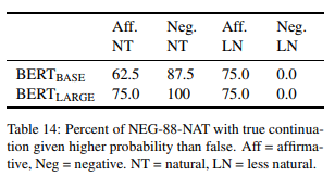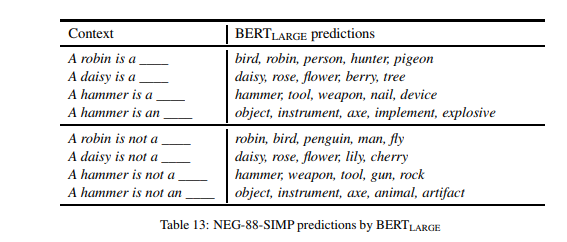 预测检验的定性分析 表 13 显示了 BERT(LARGE) 在肯定、否定两种情况下的预测示例。我们可以清楚地看到上述结果所显示的现象:对于肯定句,BERT 通常会产生正确的补语(至少在前两个),但这些补语在加上否定后基本上保持不变,导致许多明显不正确的补语。