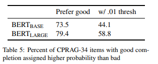 如果我们引入概率差的阈值,可以使我们的标准稍微更严格一些。根据这些项目的数据,好的和坏的完成之间的平均完形填空概率差约为 0.74,反映出人类对完成质量差异的强烈敏感性。为了测试 BERT 分配更多实质性不同概率的 item 比例,我们将筛选出良好完成概率高于 0.01 的 item。