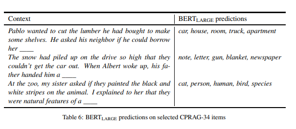 表 6 显示了三个示例项目以及 BERT(LARGE) 的前五个预测。在每一种情况下,BERT 都会提供了在第二句话的上下文中合理的结果词,但没有考虑到第一句话提供的上下文,特别是,预测显示没有证据表明它能够推断出有关场景的相关信息或第一句中描述的对象。例如,我们在第一个例子中看到,BERT 正确地将注意力集中在人们可以接到的东西上,但是它没有推断出要借的东西是用来切割木材的东西。同样,BERT 没有发现第二个项目的铲雪主题,这使得推理出一组奇怪的完成。最后,第三个例子表明,BERT 已经确定了一个动物主题(毫不奇怪,给出了“动物园”和“动物”),但它并没有应用黑色和白色条纹这一短语来确定斑马这一合适结果。总之,这些例子说明,在常识推理和语用推理的目标能力方面,BERT 在这些更具挑战性的案例中失败了。
