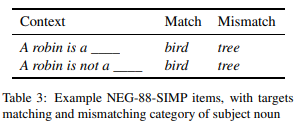 所需信息的预测 因为这些项目中的否定上下文是高度不受约束的(A robin is not a _?),因此预测准确度不是衡量否定上下文的有用指标。我们只测试肯定上下文的预测准确性,这使我们能够测试模型对上位词信息的使用(robin=bird)。目标否定出现在敏感性试验中。