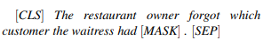 在第二个句子对中,我们看到模型在两个词序下选择“served”作为 top 延续,尽管对于第二个词序,这产生了一个不太可能的场景。在这两种情况下,对合适的词序,模型为“served”分配的概率要比不合适的高得多。对于 BERT(LARGE), 差异为 0.6;对于 BERT(BASE), 差异为 0.37;但是,值得注意的是,对于“which waitress the customer had _”,没有任何一种模式可以识别出语义上更合适的延续。
